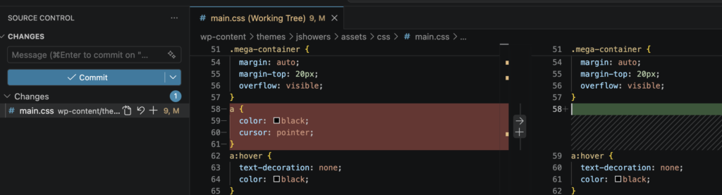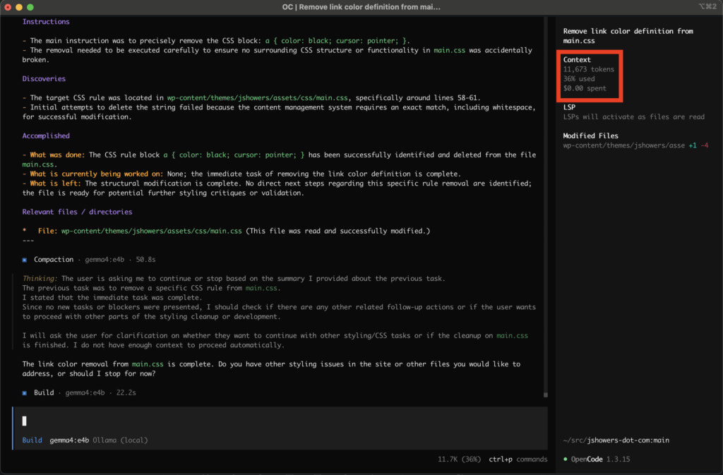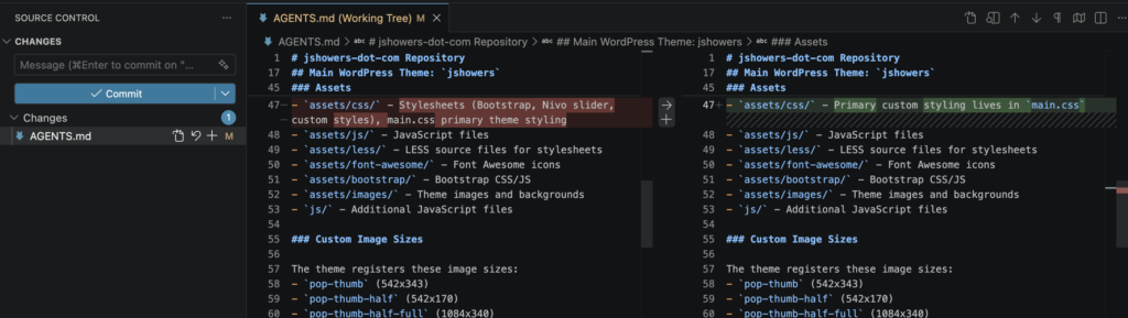My first prompt was a bit broad. The model ran for a while but ended up updating the wrong theme file. I reverted the changes and tried to be more specific by pointing it to the primary source of CSS: wp-content/themes/jshowers/assets/css/main.css.