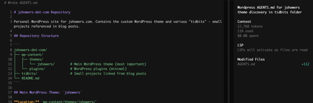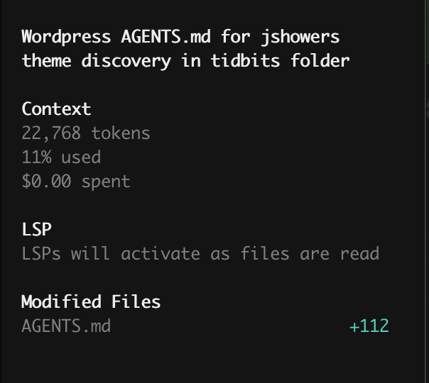 AGENTS.mdfile for this repo. It is a wordpress repo (without the WP files). The jshowers theme is the most important. There is a tidbits folder you can do discovery on. These are linked to from within blog posts. The main feature of this repo is the wordpress theme.