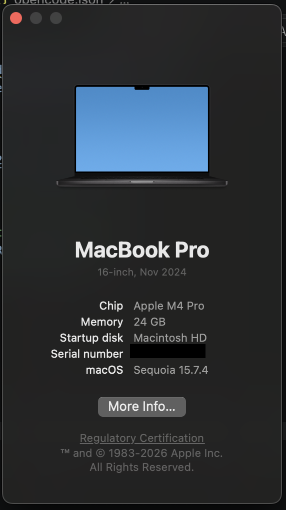 Specs: MacBook Pro, M4, 24GB Memory, macOS Sequoia 15.7.4.