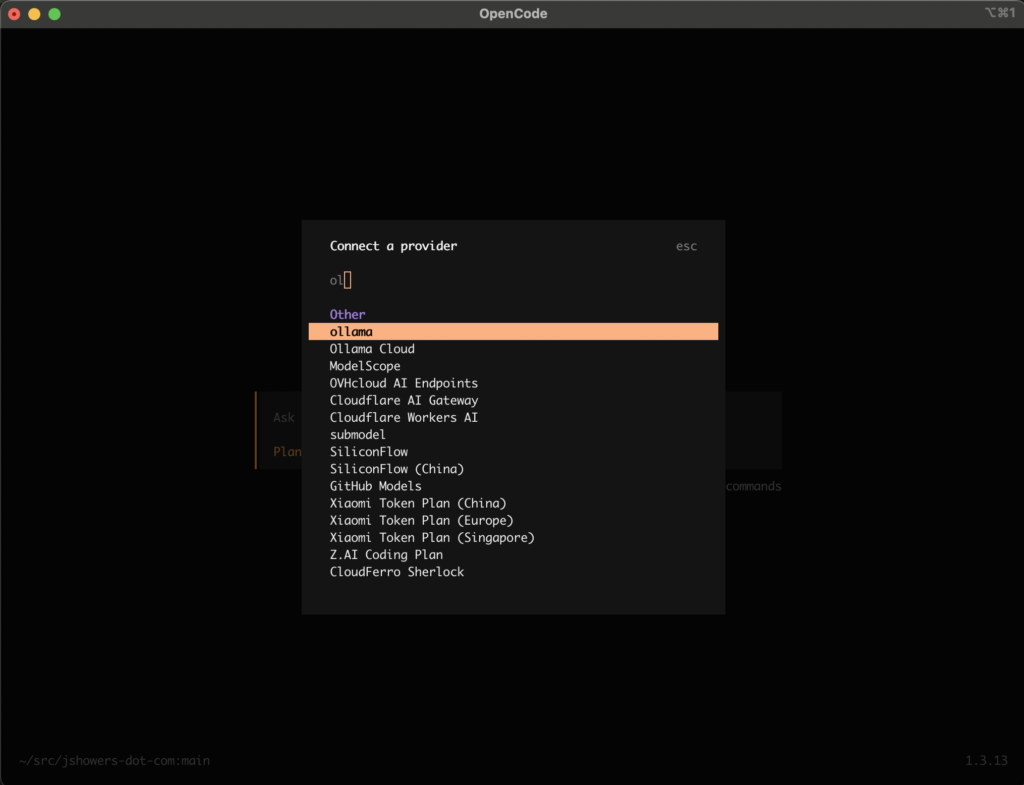/connect. - Select the Ollama option that now appears thanks to your config.